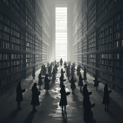 A large, dimly lit library with tall bookshelves, all in muted shades of grey. Rows of students holding grey books stand scattered throughout, their faces expressionless and drained of color. All the students are staring intently at one student, creating an atmosphere of tension and focus. The entire scene is bathed in grey tones, with a somber, muted atmosphere.