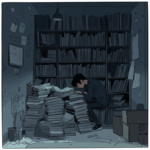 A cross-sectional view of a dorm room filled with grey tones and dim lighting. A single student is inside hunched over, struggling with a mountain of grey books, their expressions showing frustration and exhaustion.