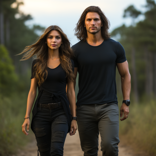 **A full body image of a woman with long silky hair, like Elena Gilbert, wearing jeans and a tank top, standing in the woods with a handsome man in jeans and t-shirt by her side. They look like a couple--s 750