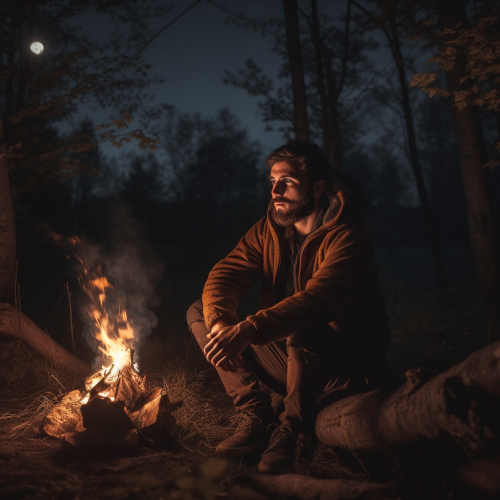 A man sittin by a fire at night in the woods, basking in the glow, --v 5.0
