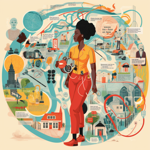 In the style of South African Illustrator Fran Labuschagne, utilizing the color palette of Lemon Yellow, Tangerine Orange, Scarlet Red, Aqua Green, Fossil Gray, Sea Green, and Sapphire Blue, create an graphic and simple illustration that depicts many pathways for health practitioners to effectively fix the health care system and improve the well-being of Black communities --v 5.2