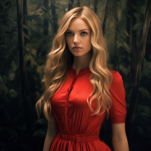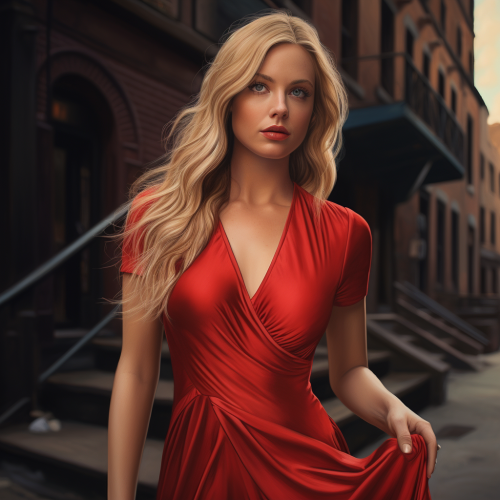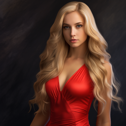 Woman with long blonde hair wearing a red dress, hyper realistic, photo realistic