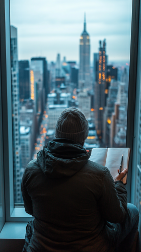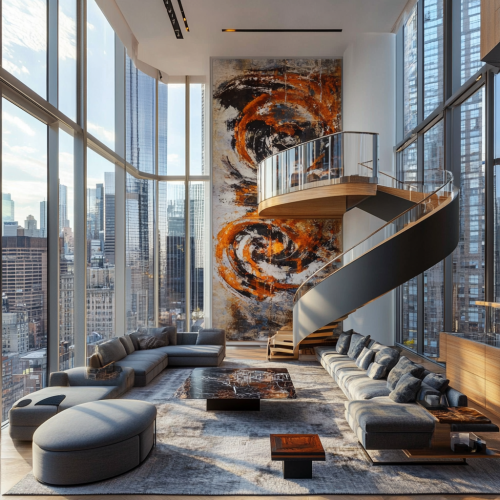 Leo's apartment, floor-to-ceiling windows, modern furniture, city skyline view, abstract art, floating staircase, panoramic view, photorealistic, stunning, 8k, award-winning, dramatic