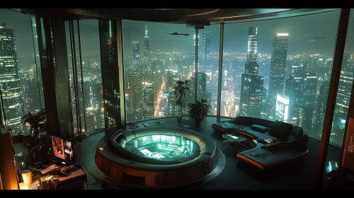 a cyberpunk apartment with a sunken circular lounge area - everything is sleek and rich and has an incredible view of an enormous, endless sprawling city - hyper realistic --ar 16:9