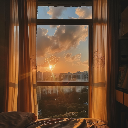 You can see the window of the apartment, the curtain gap, the sunrise, and the sun