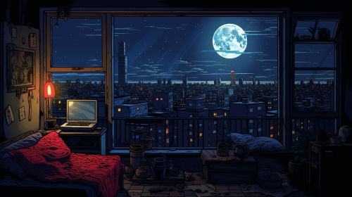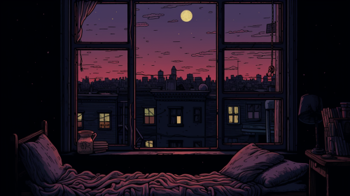 woodcut, pixelart, lofi, night, small apartment, window, cozy, gloomy colors --ar 16:9
