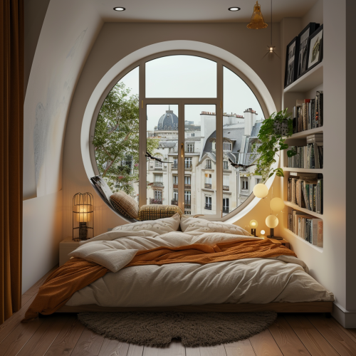 cute small bedroom with big tall round top window, city outside --v 6.0
