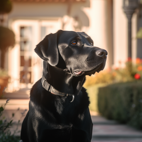 Black labrador, executive k9, fit, peacefully sitting in front of gorgeous beverly hills mansion, smiling, pov 40 feet away, clear sky, sunny, soft light bloom, setting Premium Portrait, realistic, detailed::4 well-lit, sharp-focus, artistic, unique, award-winning photography, Canon EOS 5D mark IV DSLR, f/8, ISO 100, 1/250 second, natural light, professional::3 --v 5.0