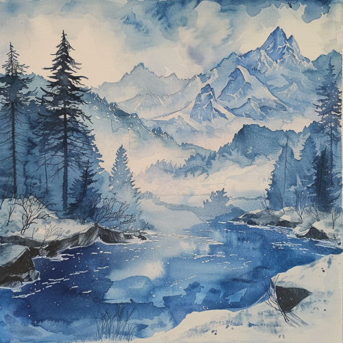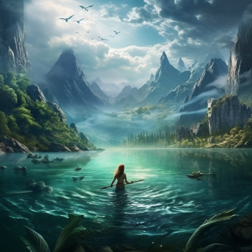 A long tail mermaid in a mountain lake, swimming around, fantasy landscape