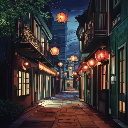 vibrant nigh time downtown back alley, two story buildings clean paved, asian architecture style awning, periodically on ether side of alley attached to building lined with lit asian lanterns