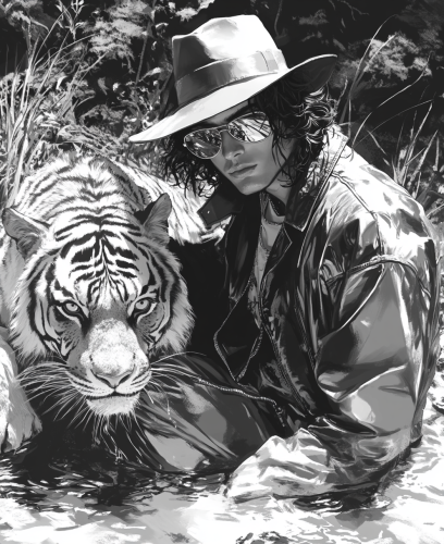 Manga Comics graphic black and white style. fashionable man on sunglasses, hat and leather jacket dressed dressed on the river beach with tiger. Story comics --v 6.1 --s 250 --ar 179:217