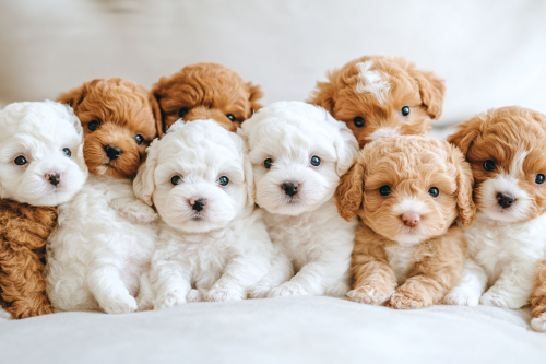 Ten brown and white baby Bichon Frisé puppies with big eyes, cuddled together cute pet photography in the style of kawaii style, simple background, high-definition wallpaper, cute --ar 3:2 --v 6.1