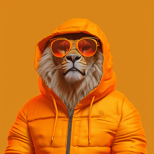 A real lion wearing a hoodie and sunglasses, orange color background --s 250 --v 5.1