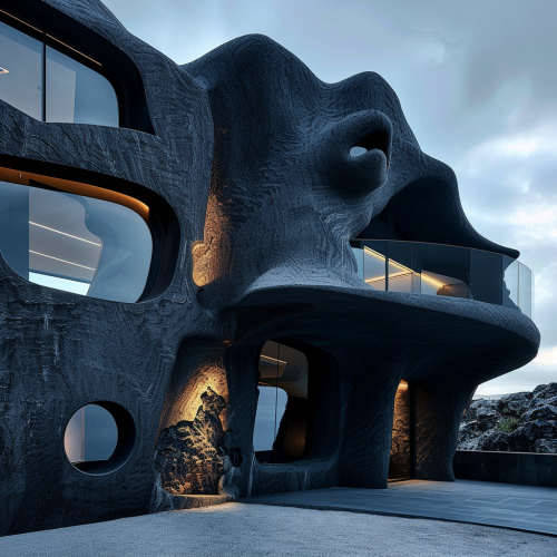 a front view of a black innovative house, in the style of isaac julien, organic stone carvings, 32k uhd, desertwave, minimalist sets, poolcore, rustic futurism, in the outskirts of london, minimalist, luxury, stylish, white lighting from below up to the front of the house
