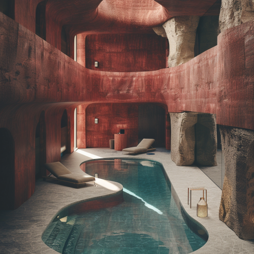 aerial view 3d schematic of luxury spa, ultra minimal, rentagular pool, arches one wall is entirely a video wall of morrocan desert sky at night with massive moon on the screen --v 6.0