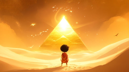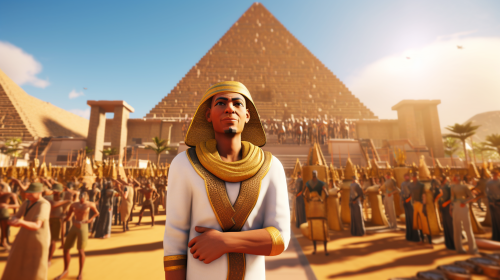 A young Pharaoh Khufu stands confidently at the construction site of the pyramid, adorned in a luxurious ancient Egyptian royal robe, with golden jewelry glimmering in the sunlight. He wears a proud smile, his eyes filled with dreams for the future. Around him, skilled workers bustle, transporting massive stones and carving with precision. In the background, the outline of the pyramid rises majestically, bathed in warm sunlight. The sky is a deep blue, dotted with birds soaring above, symbolizing freedom and hope. The color palette features bright golds and blues, with Khufu's robe in vivid reds and blues, contrasting against the simple earth tones of the workers' attire, highlighting his youthful power and leadership, Chibi-style with white background --v 5.1 --ar 16:9 --style raw