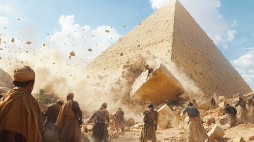 A dramatic scene at a pyramid construction site where a giant stone is cracking and breaking apart, causing chaos among the craftsmen. The craftsmen, wearing traditional Egyptian attire, display expressions of fear and panic as they scatter in different directions, some with wide eyes and others shielding their faces. Dust and small stones are flying in the air from the broken stone, creating a tense atmosphere. The unfinished pyramid looms in the background under a bright blue sky, adding to the urgency of the moment. --ar 16:9