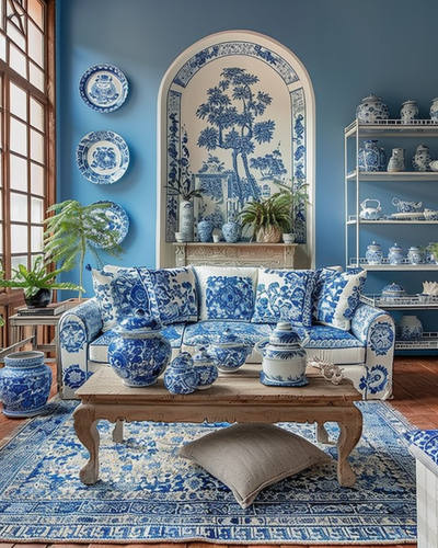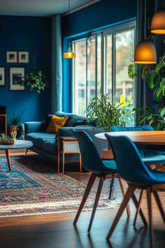 Create An eye-catching livingroom design, sofa, table, rug, blue wall, blue dinning chairs, modern cozzy interior, The background BLACK Sony A7S III and a 35mm f/2 ASPH lens. --ar 2:3