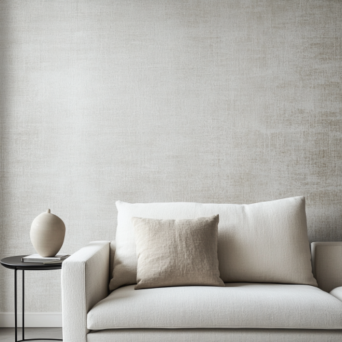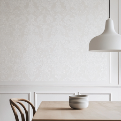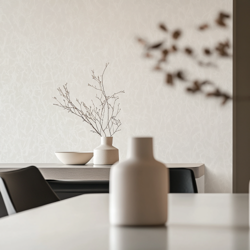 A dining room wall with light-colored wallpaper in soft beige and white tones, featuring an elegant, organic pattern resembling vines or leaves, creating depth and texture. The focus is on the wall, with soft sunlight filtering through sheer curtains, casting gentle shadows that enhance the tranquil and warm atmosphere. The subtle setting includes a round table with a linen cloth and warm wooden chairs, only partially visible, to maintain a minimalist and serene interior design style. The scene is captured in high-resolution photography, emphasizing the calming effect of natural light and soft, neutral tones. –ar 101:128