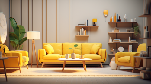 3d blender render, wallpaper, living room, front-facing, hints of yellow, white, gray tones, 100mm lens, 4k UHD, isometric, --ar 16:9