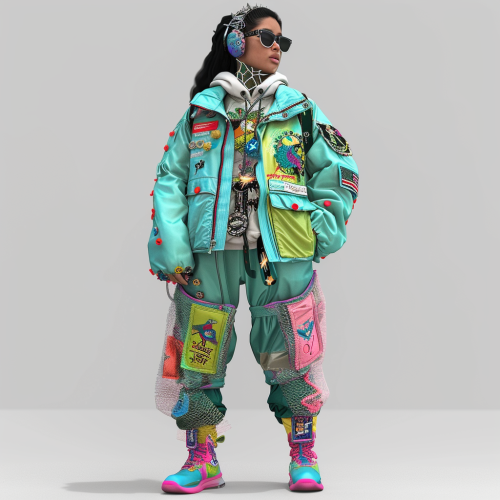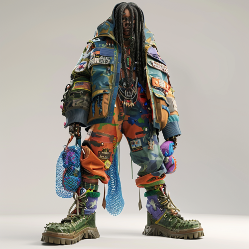 3D rendered vinyl very extreme exaggerated features attractive streetwear model girl wearing a massive very exaggerated giant oversized aviator jacket with war patches and award pins with giant very oversized colorful cargo pants with multiple giant net pockets over blue bird patches and giant extremely oversized Yeezy brand running shoes made of dream shaman spirit frog shaman on a white background