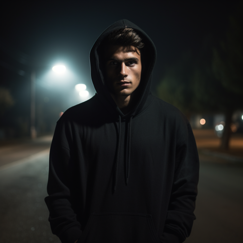 editorial shot of a handsome male model wearing a plain black hoodie in a futbol street playgroun of a suburban area of mexico at night, fog, fashion shoot, streetwear shoot, hype , 8k