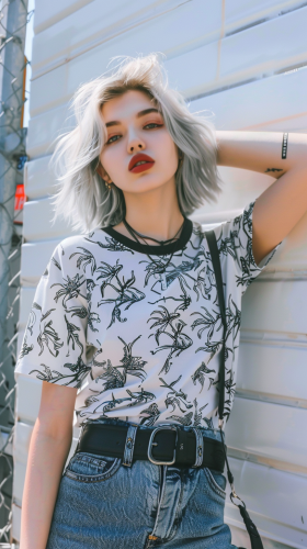 #475396111# Hot top model beautiful 19yo woman with silver hairstyle, perfect long model legs, sharp eyes, Casual weekend outfit featuring a relaxed fit printed short sleeve t-shirt, cuffed denim pants, comfortable low-top shoes, and a casual shoulder bag,eauty Instagram model, aesthetic, streetwear, fashion aesthetic photo, ultra quality, high details, 8k, masterpiece , v6 --ar 9:16