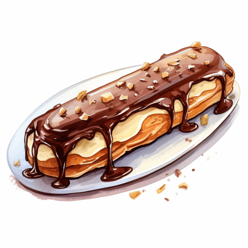 Éclair enwrapped with chocolate flakes in a long shape sytlish ceramic appetizer dish, Restaurant Menu, watercolor, Hand drawn style, clipart, Cartoon, Masterpiece, Pure white background, Detailed, Ready to edit, Bird's-eye view