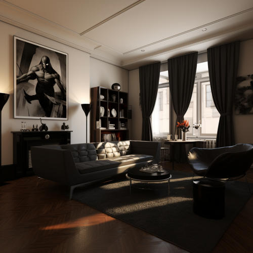 a livingroom with several framed pictures hanging up on the wall, in the style of dark gold and dark black and cream, de stijl, tonal, assemblages, handcrafted designs, minimal, tonal palette --v 6.0