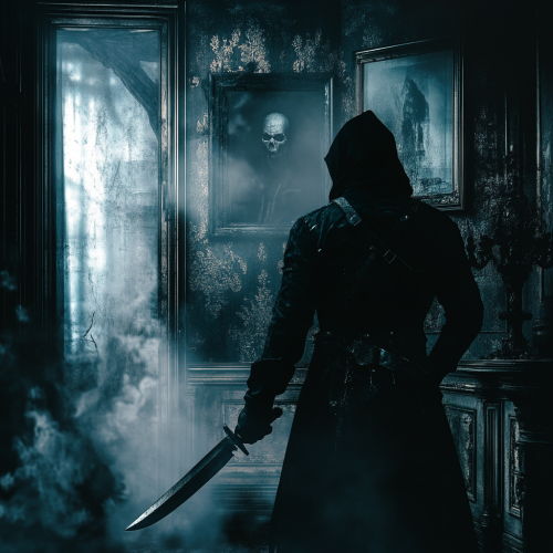 a frightening ghostly murderer standing aggressively with a knife, Victorian background decor, abandoned room, dnd art style, horror theme, Gothic theme, terror mood, cool ambient lighting, 8k HD
