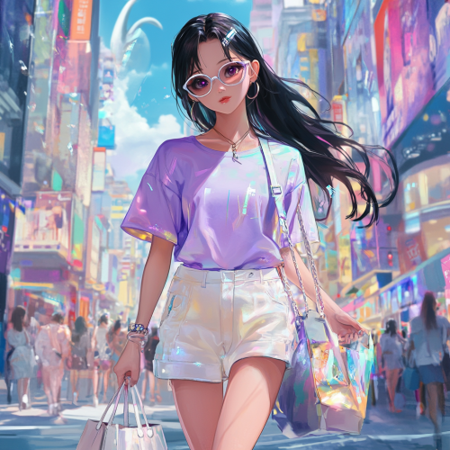 A stylish teenage girl with long black hair tied back, wearing a pastel purple T-shirt and a cream-colored short skirt. She has on white sneakers, white-rimmed sunglasses with dark lenses, and one hand is holding a shopping bag slung over her shoulder to rest behind her. The background is a bright and lively cityscape with a relaxed, sunny atmosphere.
