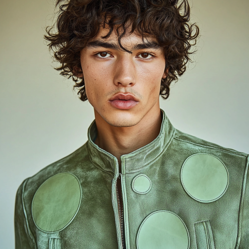 a high quality fashion photo of a model wearing a short light-green suede leather jacket for men. The jacket has oval patches across each side abive the chest and on the shoulders. Autumn vibes. --q 2 --s 250 --v 6.1