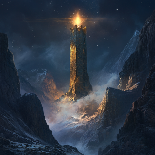 A tall stone tower stands amidst towering mountains, its structure ancient and weathered. At the top of the tower, a radiant gemstone glows brightly in the night, casting shimmering beams of light across the surrounding landscape. The dark sky is filled with stars, and a soft mist curls around the base of the mountains, enhancing the tower’s mysterious presence. The glowing gem at the tower’s peak illuminates the rocky terrain below, creating an ethereal and mystical atmosphere.