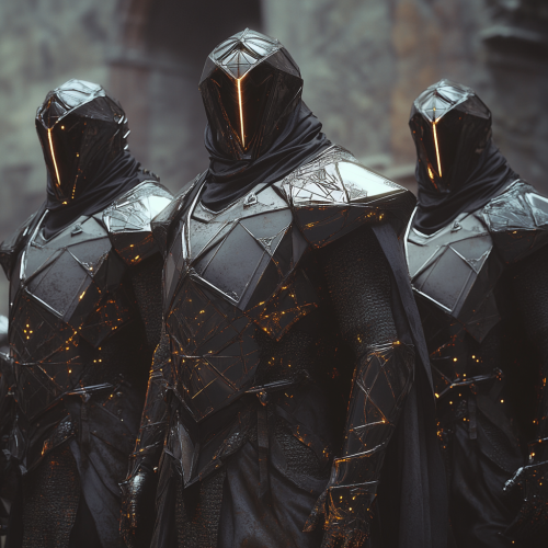 three men wearing highly detailed geometrically shaped armor stand heroic and imposing. Their armor slightly glows with magic, and the geometric shapes of the armor twist in impossible shapes. Highly detailed. Cinematic quality. Dynamic lighting and scene. Highly realistic.