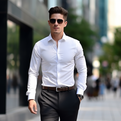 photo of Handsome men and women with neat short hair, standing back to back, wearing technological accessories, wearing a technological white shirt, upper body, futuristic technology style, dark blue background, real photo, with the style of James Jean, There is also a Sorayama base style. --ar 64:51 --v 6.1 --stylize 250