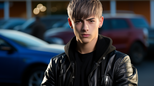 a photorealistic medium-body shot of a blond short-haired male junior high school student standing in front of an expensive black sports car. He wears a black leather racer jacket with sponsor patches on it and ripped blue jeans. He has a side-swept undercut and earlobe piercing and some sparsely spread stubble. Dramatic lighting. Photorealistic, high quality, hyper-realistic, up beta, 8k uhd, --no painting --ar 16:9 --s 150 --v 5.2