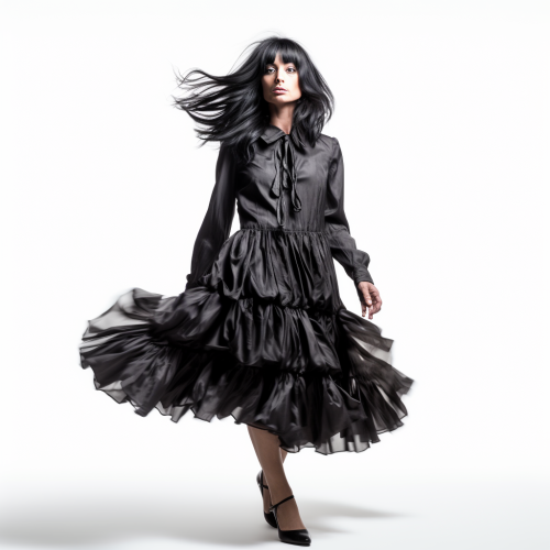 40 year old man dressed in a sunday dress and wearing a bad wig walking towards the camera, white background, photo realistic, commerical photography