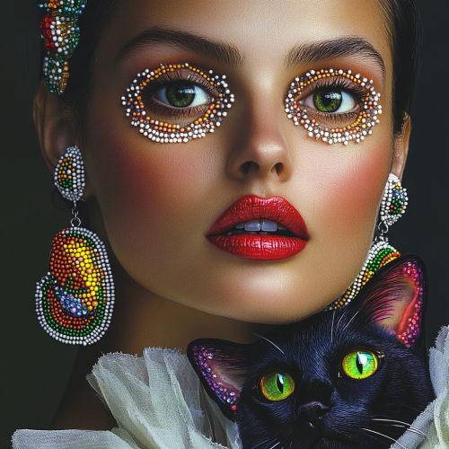 create a realistic image of a fashion photo, which shows a beautiful model showing off cat earrings funny unusual shapes, bright colors opposites --s 50