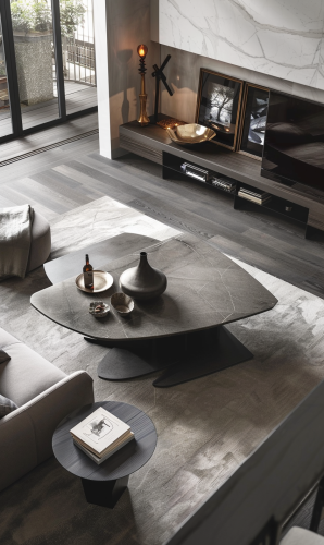 Grey table, stylish living room, enlarged table, angled upwards view --ar 3:5