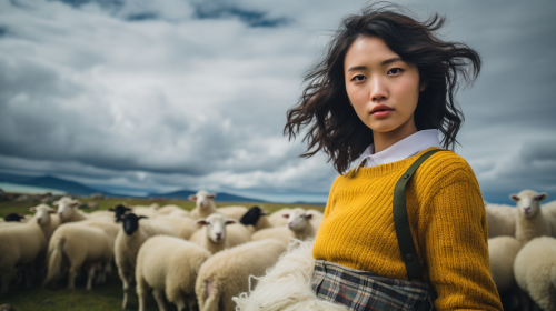 Beautiful Asian 20 year old woman wearing wool sweater, paired with a short yellow skirt. The wide angle lens captures the essence of euro fashion inspiration. Standing on the grassland of scotland, next to sheep in the fields, a large cloud on the sky is very low, soft --ar 16:9 --c 10 --style raw