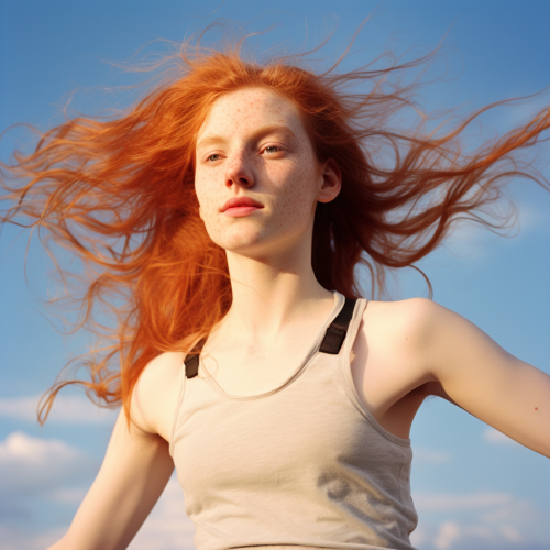 a photograph as taken by Ryan McGinley, of a 42 year red head, long hair non-binary androygnous person in a sleeveless shirt, smooth arms , expressive, positive and emotional - new york, brooklyn --no tattoos
