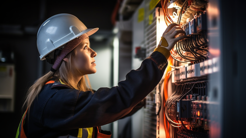 Female commercial electrician at work on a fuse box, adorned in safety gear, demonstrating professionalism, --ar 16:9