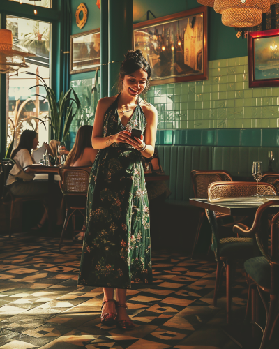 A bold, artistic image with primarily a bold green color, with some blacks to add depth and interest, and light blue accents. The subject is a woman, a successful restaurant owner dressed fashionably. She stands inside her restaurant and is looking at her phone, smiling. The restaurant in the background is bustling and full of people, and hip, colorfully decorated in bohemian style, with bold tile and rattan furniture.:: --v 6.0 --style raw --ar 4:5 --s 95 --w 5