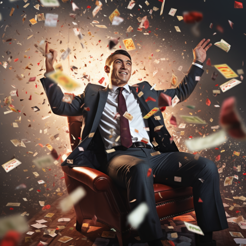 In the style of grand theft auto promotional art. A japanese boxer in a business suit succeeds at a presentation. Confetti bursts from a punching bag he strikes.