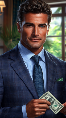 a highly successful man, dressed in a navy blue tailored suit, holding his hand out to help someone, in a professional , successful setting, money and gold everywhere, three point light, dramatic wideshot, color epic cinematograph, cartoon style drawing, dynamic pose, cinematic, epic, dynamic movement, happy, smiling --ar 9:16 --c 80 --s 1000