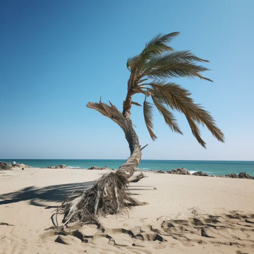 closeup of a broken palm tree on a sunny beach in abu dhabi, realistic, fine details