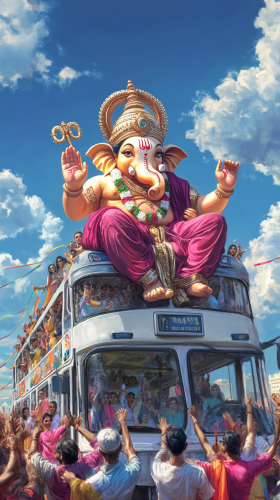 hyperealistic lord ganesh wearing colorful clothes riding white charted volvo bus huge crowd welcomes him larger than life idol of ganpati He's outside during a summer day, some little clouds color the deep blue sky, brightnned by the shinning sun. People are happy dancing in his arrival --ar 9:16