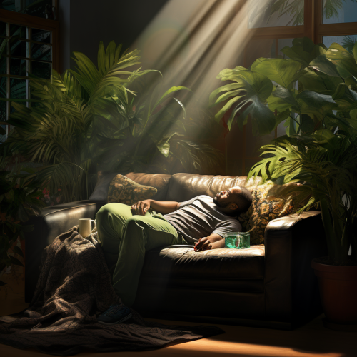 a dark skinned man slouched on green sofa, dark inside, sunny outside, a light beam falls onto mans torso, face is in the dark, house plants, depressive, moody, tropical, oriental, realistic --style raw --no face