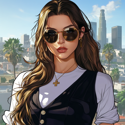 a young woman, caucasian, wearing black round sunglasses with gold rims, long brunette hair half up, half down with two strands down either side of her face. wearing a long white sleeved tshirt with a black buttoned sleeveless dress on top. LA skyline behind her. GTA V cartoon style