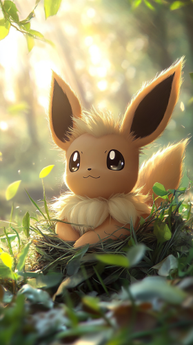 Chibi-style baby Eevee emerging from a cozy, fluffy nest made of soft grass and leaves. Eevee looks curious and excited, with its large, expressive eyes and small, twitching ears. The background features a sunny meadow with gentle rays of light filtering through the trees. 8K, HDR, high quality, --ar 9:16